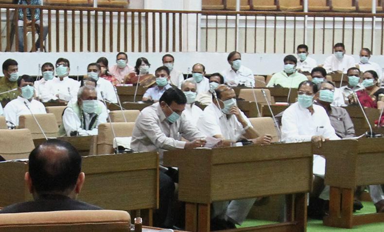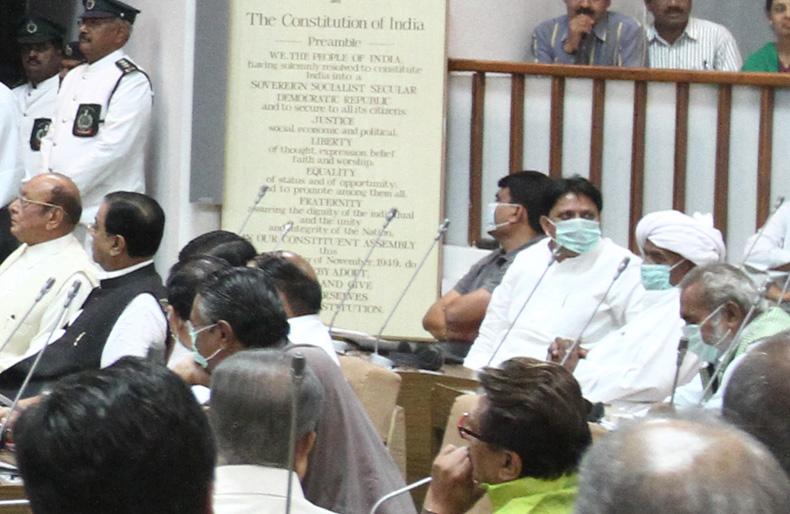 So for today, Congress party MLAs wore masks inside the assembly house. They disturbed Governor’s speech and later also staged walk out. Presented above are the photographs of Congress MLAs sitting in the house wearing masks in connection with swine flu situation in state.