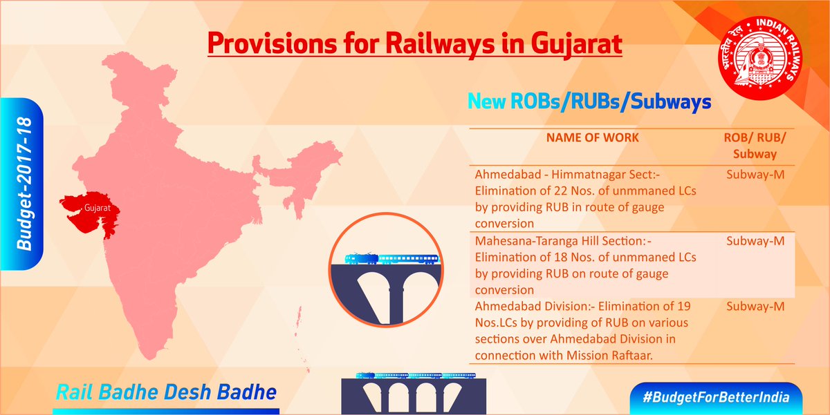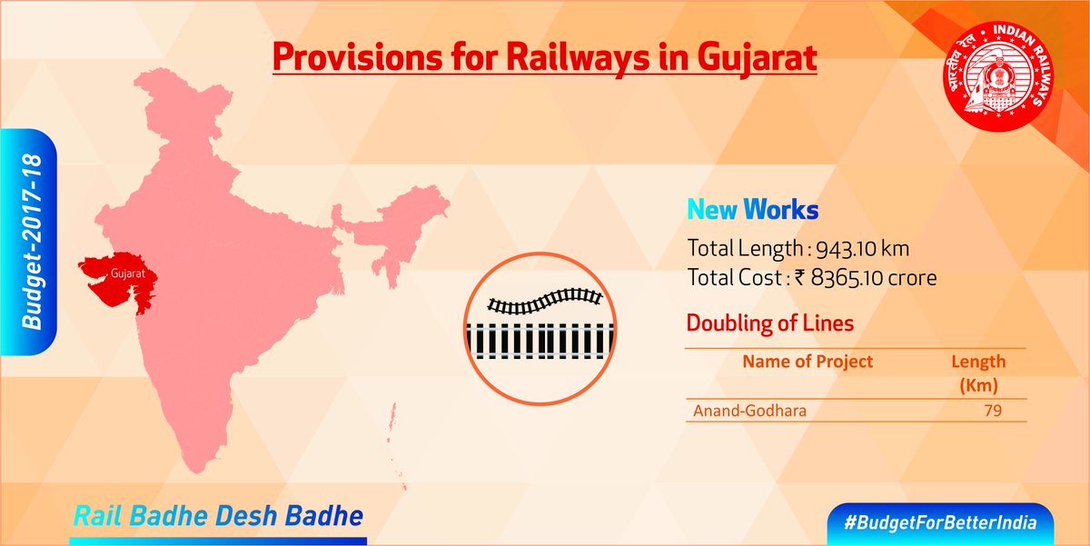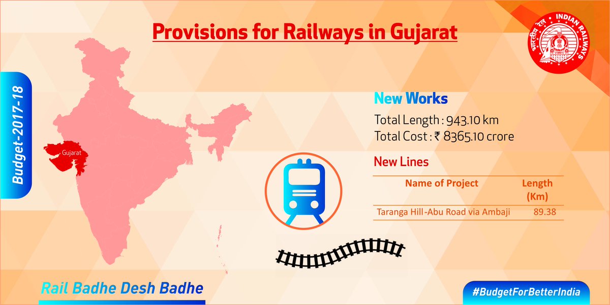 New Delhi: As railway budget was merged with general budget of Government of India this year, there was minimum or no clarity on allocations/provisions made in railways for various states. Today, the railway ministry shared some memes over social media giving details regarding state wise allocations made in the budget for railways. Presented are the slides regarding Gujarat allocation.