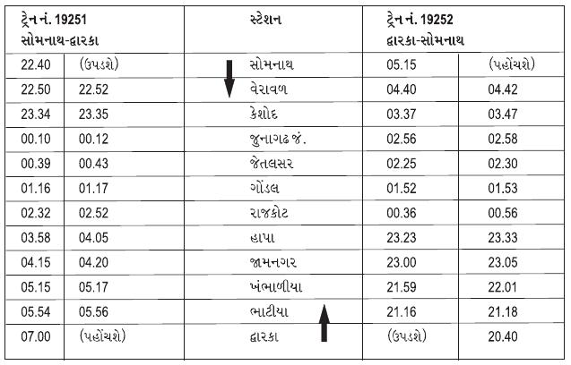 In its regular run, Train No. 19251 Somnath – Dwarka Express will depart from Somnath at 22.40 hrs every day from 12th April, 2013 to reach Dwarka at 07.00 hrs the next day.In its return direction, Train No. 19252 Dwarka – Somnath Express will depart from Dwarka at 20.40 hrs every day from 13th April, 2013 to reach Somnath at 05.15 hrs the next day.