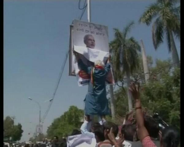 Congress party’s Vadodara Lok Sabha seat candidate Madhusudan Mistry was detained today around noon by police after he attempted to remove Narendra Modi’s hoarding opposite local Congress office with party workers. Mistry and his supporters were refusing to leave a road after failed attempt to remove Modi’s hoarding. Police had to use some force to clear the road.