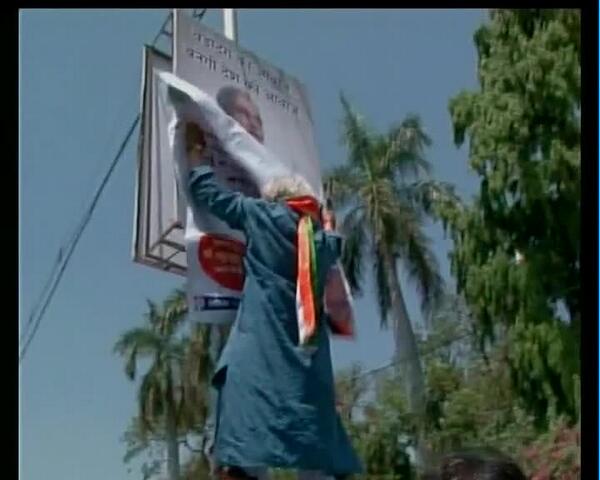Madhusudan Mistry climbs ladder to remove Narendra Modi’s hoarding, detained by police