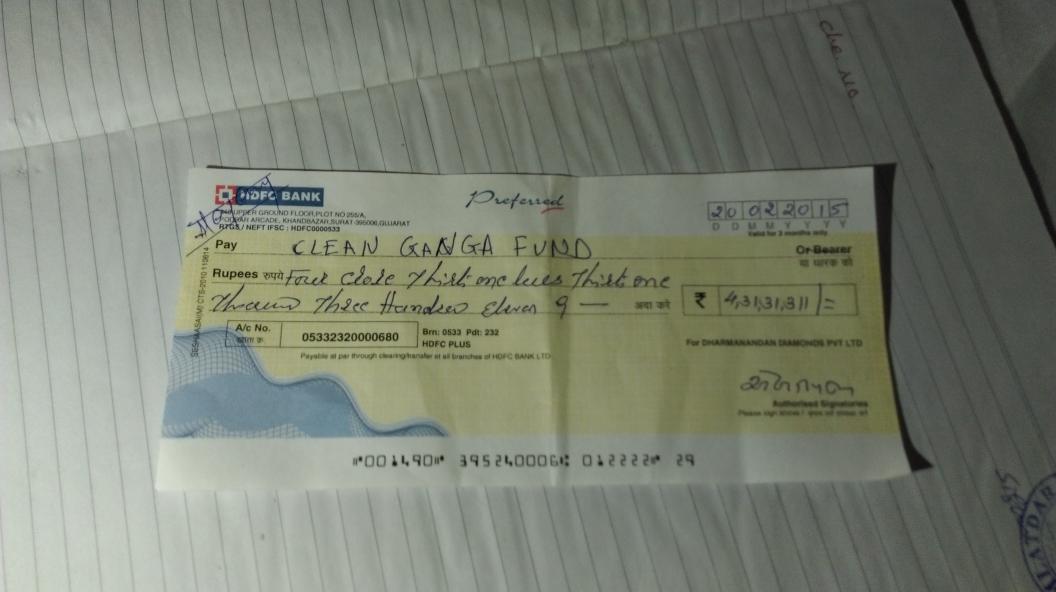 Surat based Dharmanandan Diamond owner Laljibhai Patel who won this suit in auction paid amount of bid by cheque to Clean Ganga Fund. A photograph of this cheque(attached with this article) was put online by a journalist. As this photo with Laljibhai’s signature was viral on social media, someone in Haryana tried to withdraw Rs. 3 crore from Laljibhai’s HDFC account by copying the signature of Laljibhai.