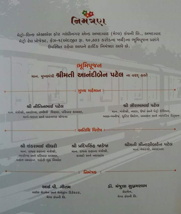 After long delay, finally the works for Ahemdabad Metro Project phase-1 are going to be launched with ground breaking ceremony in Vastral area of Ahmedabad on March 14th. The construction company will first build a service road for passage to local people and then will start building corridor. Presented here are images of invitation card of the function.