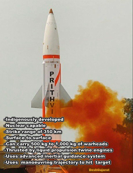 The surface-to-surface Prithvi-II missile is capable of carrying 500 kg to 1,000 kg of warheads and is thrusted by liquid propulsion twine engines. It uses advanced inertial guidance system with manoeuvring trajectory to hit its target.