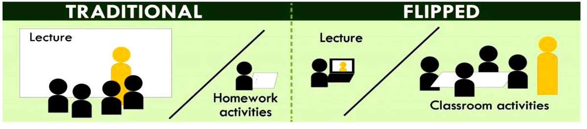 In traditional regular class-rooms, students learn in the class-room and then doing homework after reaching home. In flipped class-rooms, the students will watch video lectures at home and obtain all the necessary information, come to class-room, they will do homework in front of professor. If a student has some problem in understand the lesson, professor can teach them immediately.