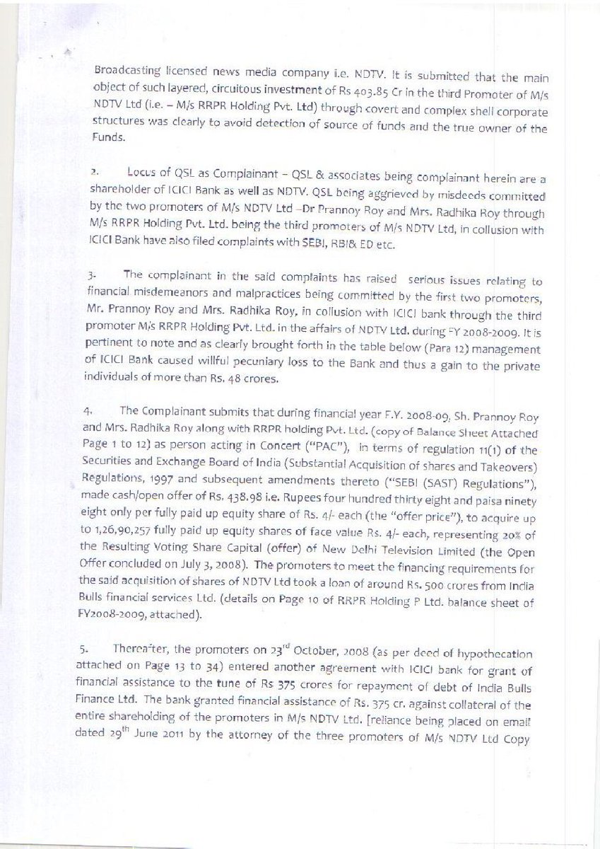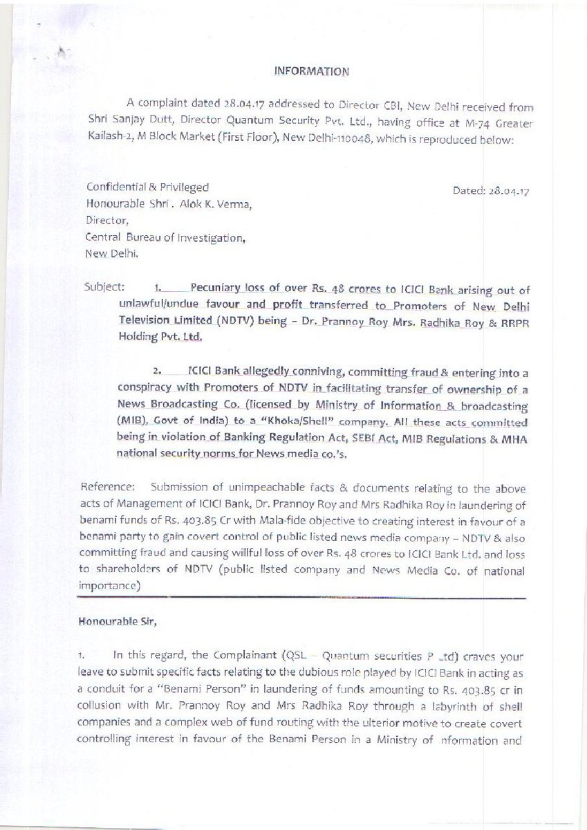 It was alleged in the FIR that said Delhi based private company in order to buy 20% of the shares of another New Delhi based TV company from the public had taken a loan of about Rs. 500 crore(approx) from a private Finance Company. To repay this loan, the said private company based at Delhi took a loan of Rs.375 crore(approx) (disbursed Rs 350 crore) @ 19% p.a. from ICICI bank.