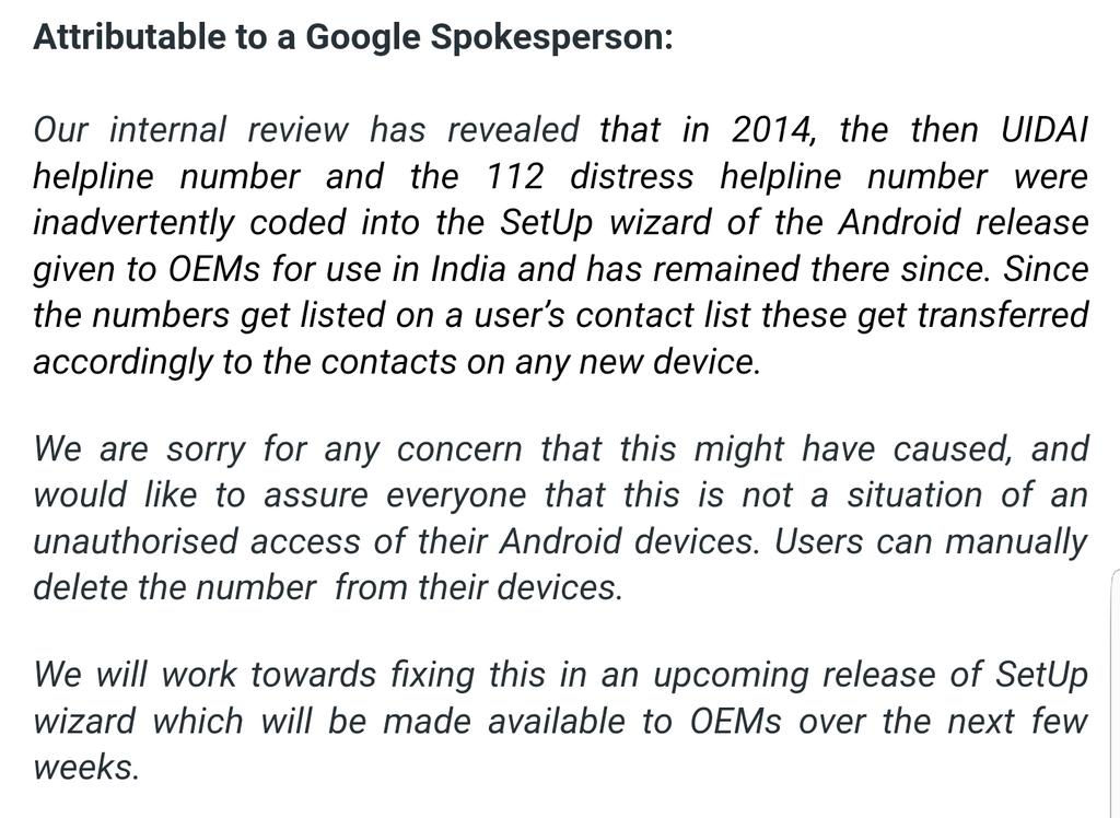 “In the wake of some media reports on default inclusion of UIDAI’s outdated & invalid Toll free no. 1800-300-1947 in contact list of Android phones. It is clarified that, UIDAI has not asked or communicated to any manufacturer or service provider for providing any such facility whatsoever. It is emphasised that the said 18003001947 is not a valid UIDAI Toll free number and some vested interest are trying to create unwarranted confusion in the public. The official helpline number for Aadhaar is 1947, which has been functional for the last two years.”