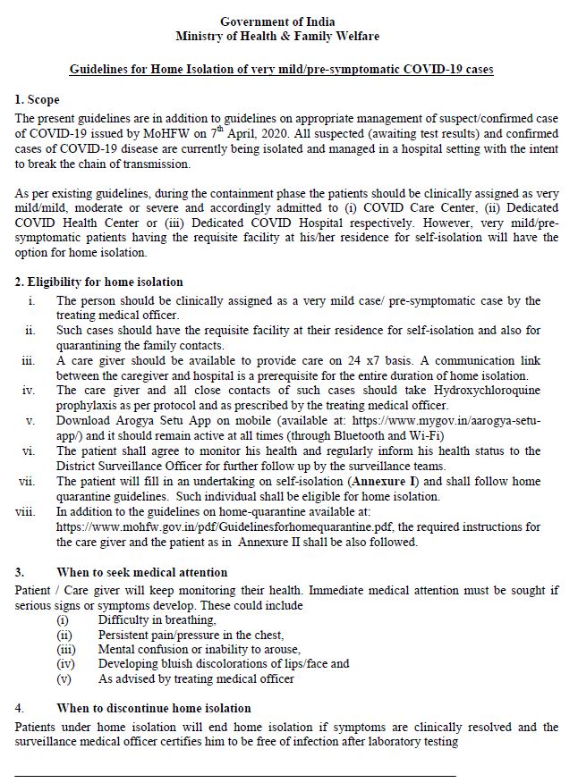 Such patients who chose for home isolation must use mask and follow social distancing norms.