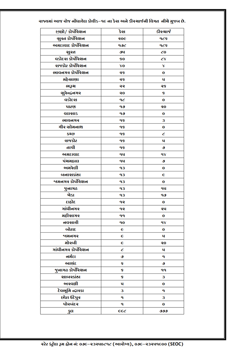 Gandhinagar: 998 new cases of Covid-19 are detected in last 24 hours ending at 5.00 pm today as per the State Health department’s daily bulletin released today evening. In this same period, 777 Covid-19 patients have recovered while 20 have died. Surat city has recorded highest 209 new cases followed by Ahmedabad city at 178. Total active cases in the State is 11,613 including 78 critical. Gujarat has so far seen discharge of 35,659 Covid-19 patients along with 2,167 deaths.
