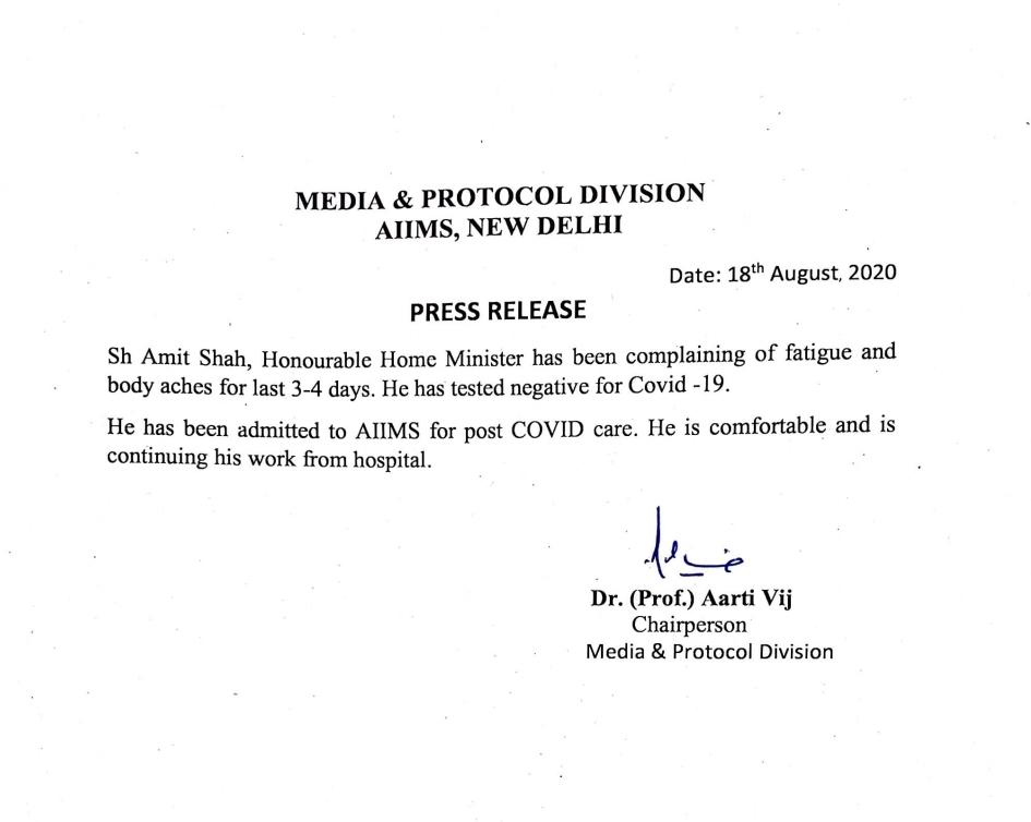 New Delhi: Home minister Amit Shah has been admitted to All India Institute of Medical Science (AIIMS) here. He was taken to AIIMS last night. Shah is reportedly admitted in old private ward on 5th floor under the observation of AIIMS Director Guleria. Shah had recovered from Covid-19 recently after nearly two-week hospitalization during 2-14 August. He was in home isolation post discharge from hospital. According to official note released by Dr. (Prof) Aarti Vij, Chairperson of Media and Protocol Division of AIIMS, ‘Shah has been complaining of fatigue and body aches for last 3-4 days. he has tested negative for Covid-19. He has been admitted to AIIMS for post COVID care. He is comfortable and is continuing his work from hospital.’ DeshGujarat