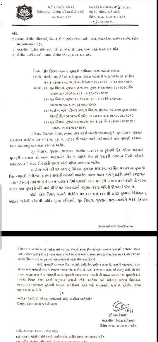 Ahmedabad: You will need to wear face mask properly while in car even if you are yourself driving a car and there’s none other in the same car. As per an order, copy of which is attached to this article, it is mandatory to wear mask when in rickshaw, cab, taxi, private or government car for all passengers and a person on driving seat. Even when a person is alone in vehicle and on driving seat, he/she will need to wear a face mask properly mandatorily or will have to pay Rs. 1,000 fine per person when caught by police for violation. It’s worth noting that earlier, the State government had exempted single persons in vehicle (on driving seat) from wearing mask.