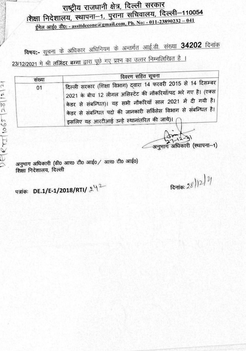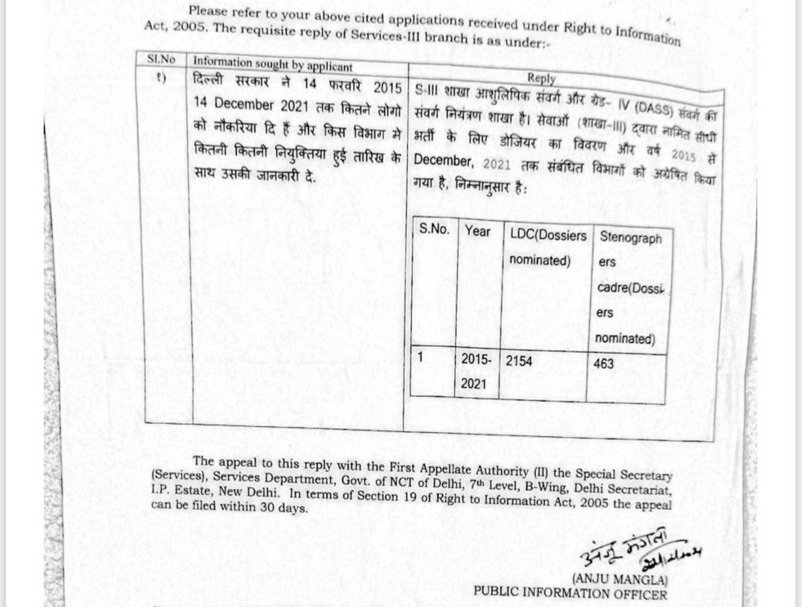 In the reply to RTI filed by BJP leader Tajinder Singh Bagga, “only 1 person got a job in 2017, 267 people got jobs in 2019 and 23 got jobs in 2020 in various departments of Delhi Government.”