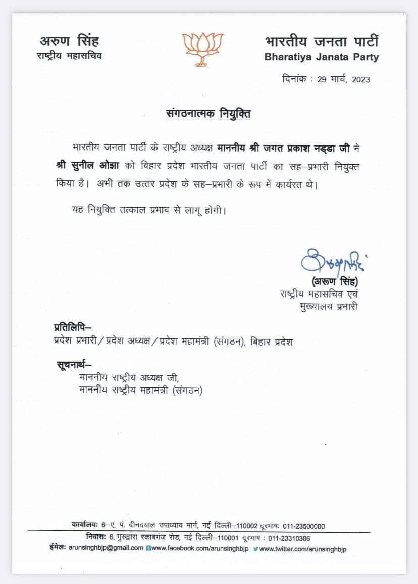Gandhinagar: Ruling Bharatiya Janata Party (BJP) president JP Nadda has appointed Sunil Oza as the joint in-charge of the party’s Bihar unit. Oza has been working so far as the party’s joint-in-charge for the Uttar Pradesh unit. Oza hails from Bhavnagar in Gujarat. He had been a member of the legislative assembly from Bhavnagar sear in the past. in August 2021 the party had appointed another Gujarat-origin leader, Bhikhubhai Dalsania as General Secretary (Organization) of the party’s Bihar unit. Bihar has 40 Lok Sabha seats. The next general elections of Lok Sabha are going to take place in the first half of next year. DeshGujarat