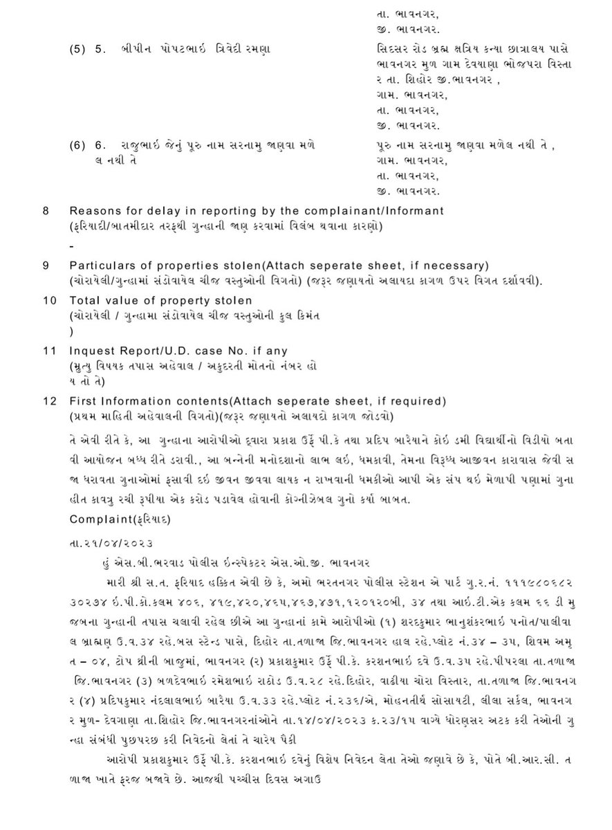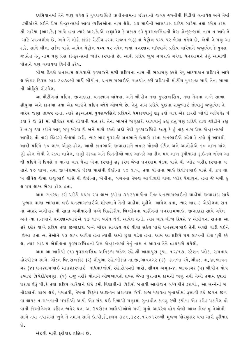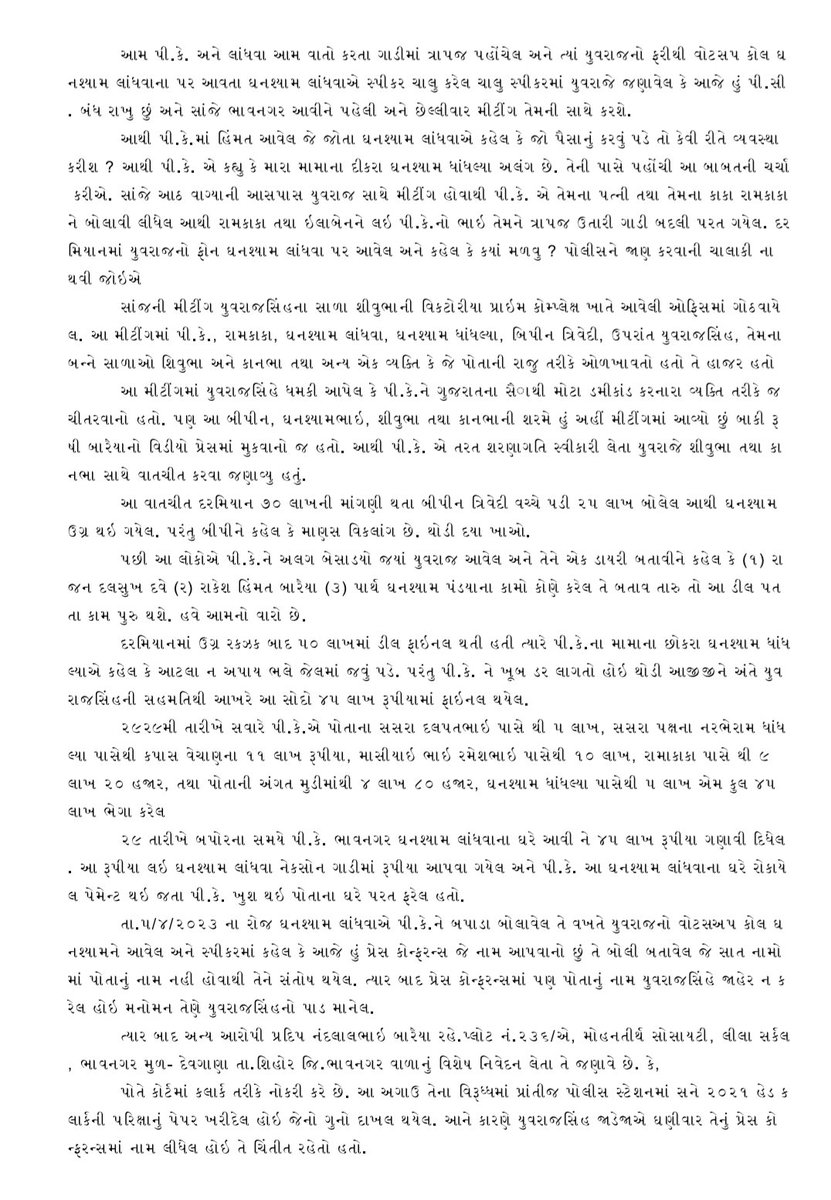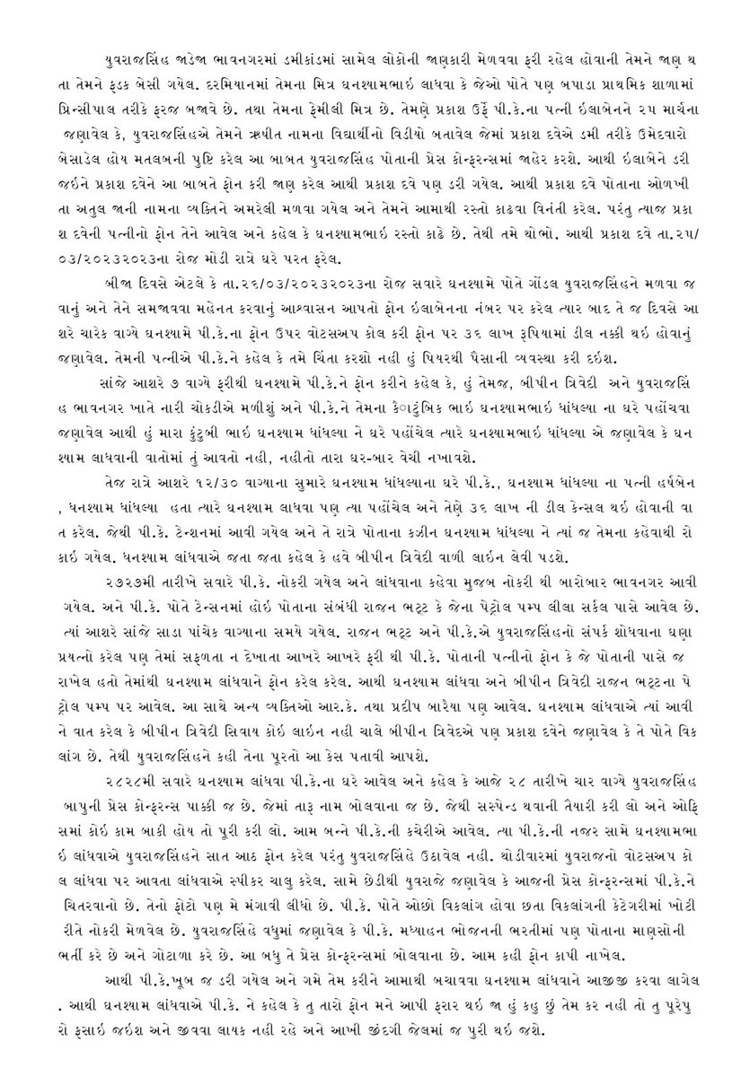 He further stated- As per the complaint, on last 25th March, Yuvrajsinh and his men roamed in Bhavnagar region and captured video of one Rushi Baraiya, a dummy person in connection with dummy exam candidates row. Yuvrajsinh then through his aide Ghanshyam showed the video to Prakash Dave (PK)’s wife. Yuvrajsinh, his aide Ghanshyam Landhva and his men pressurized Prakash and his wife and relatives. During 25-26-27 Yuvrajsinh kept the pressure on them and later did a meeting on 28th in the evening. The meeting was held at Yuvrajsinh’s relative’s office. PK’s uncle, PK’s relative Ghanshyam, Yuvrajsinh’s aide Ghanshyam, Bipin Trivedi and Yuvrajsinh’s aides and relatives apart from one Raju attended the meeting.