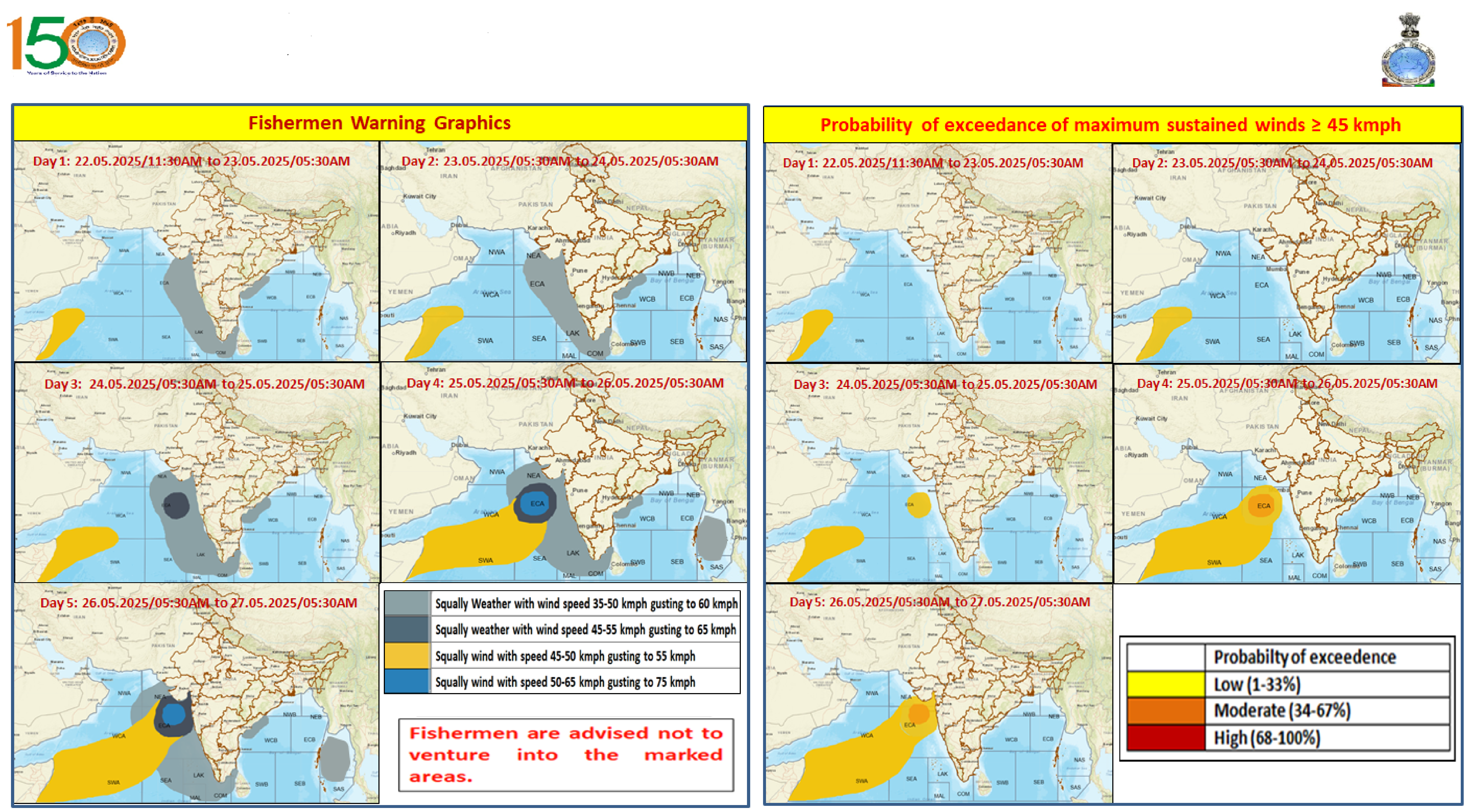 Fishermen currently at sea are advised to return to the coast by the afternoon of May 23. Fishing operations in the Eastcentral and adjoining northeast Arabian Sea will remain suspended from May 25 to 27. The IMD has also advised strict regulation of shipping, tourism, and recreational activities during this period. DeshGujarat