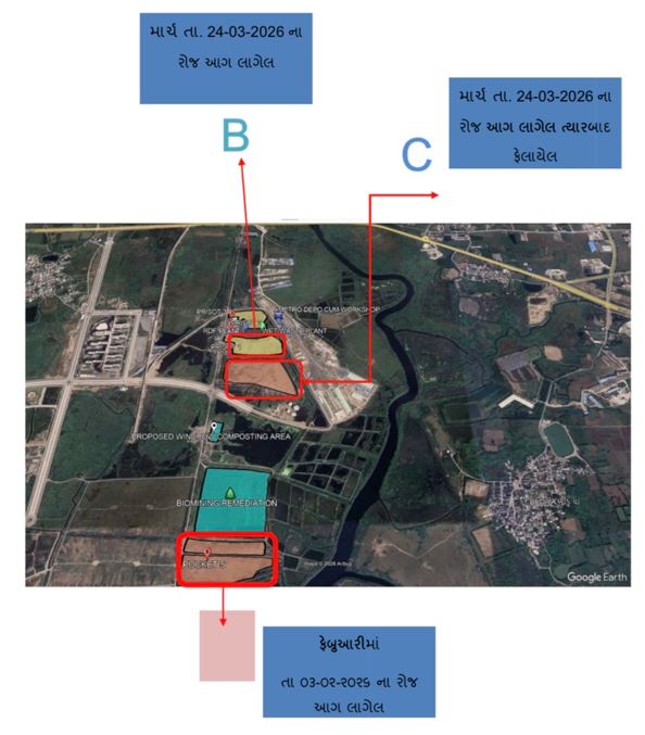 SMC informed – ‘a major fire broke out in the RDF/recycle storage area at the Khajod Disposal Site in Surat at around 1:15 pm on March 24, 2026, near the rear side of Preshort-1. Considering the seriousness of the situation, the SMC launched firefighting operation under the direct guidance of the Municipal Commissioner.’