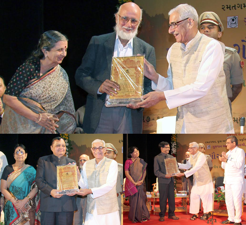 Gujarat Governor today presented Gujarat Sahitya Akademi and Hindi Sahitya Akademi awards to Shri Sitanshu Yashashchandra, Shri Suman Shah and Shri Chandrakant Mehta at Gujarat Sahitya Parishad hall today evening.
